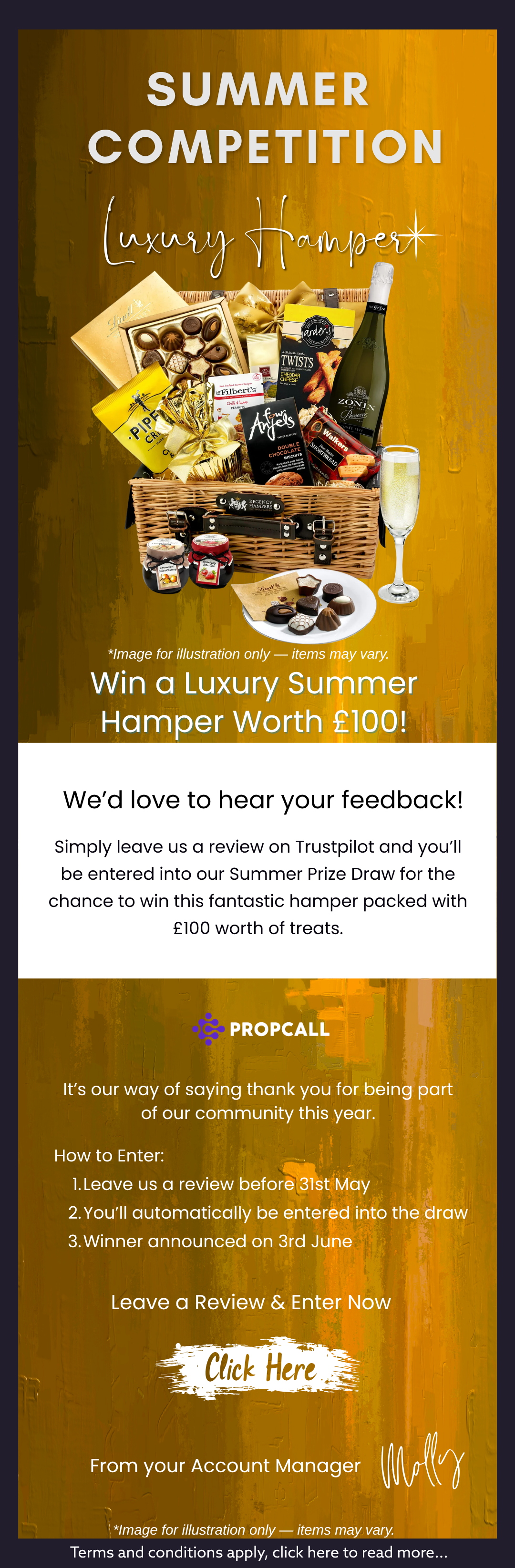 How to enter - simply follow the link in the mailer to leave a review for PropCall or visit: https://uk.trustpilot.com/evaluate/propcall.com